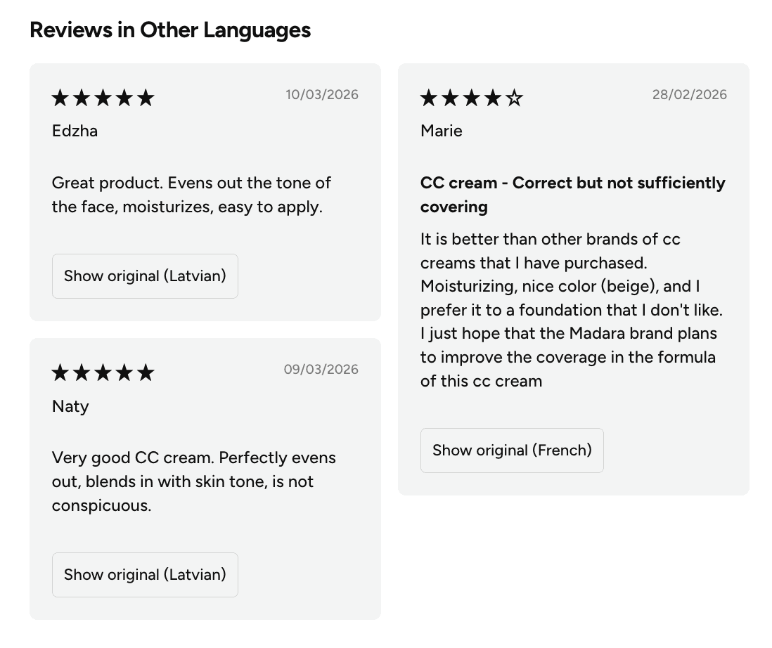 MÁDARA's store is fully localised — a Latvian customer sees the site in Latvian, a French customer sees it in French. For reviews to match that experience, the right reviews need to surface for the right shoppers.